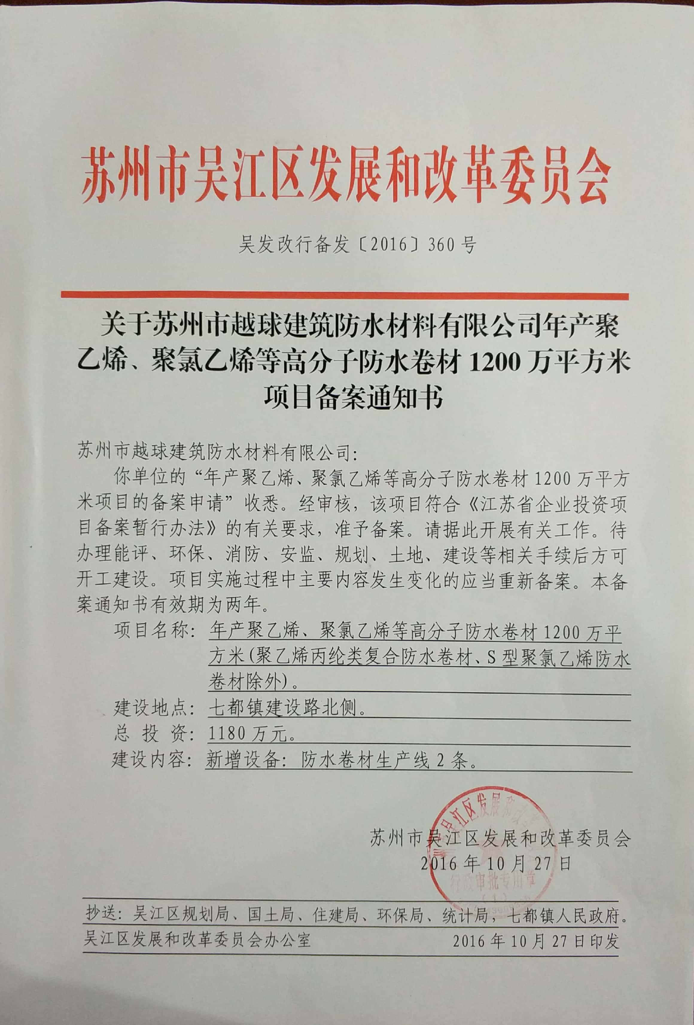 聚乙烯、聚氯乙烯等高分子防水卷材1200萬(wàn)平米項(xiàng)目通知書(shū)